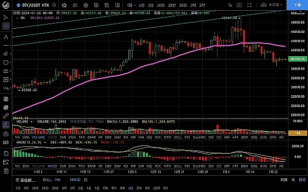 大饼昨日反弹上行最高触及40300一线受阻回落,低位跌至39550支撑反弹,恭喜跟上昨日思路的朋友多单获利700点,目前币价在40158附近运行,四小时级别底部支撑逐步抬高行情震荡上行,再次触及ma30均线压制,虽短期受阻但macd多头运行双线金叉向上,目前来看走势偏向多头,突破上行的概率较大,日线级别走势呈震荡向上,指标呈空头向下,方向相悖不适合入场,技术面来看回调并没到位,预计还会回调洗盘,然后再走拉升,后市关注ma120支撑情况可以轻仓抄底,破位则关注35000区域,思路建议逢低做多为主高空为辅,上方压制40500-40100,下方支撑39500-39000