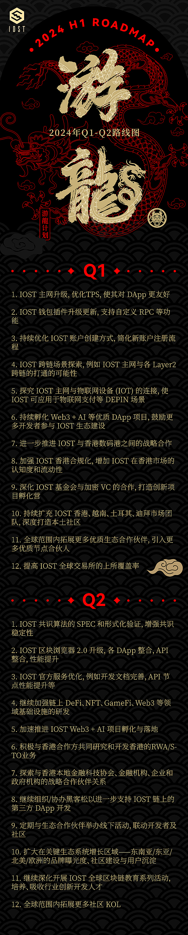 展望 2024,IOST 将继续在主网升级、全球市场拓展等诸多方面进阶式发力,加速在基础设施、跨链生态、物联网、AI、DeFi、NFT、GameFi、Web3、RWA、STO 等多元领域的战略布局,以在全球寻求更多优质 VC、KOL、节点合伙人等合作伙伴,推出更多可玩性强、回报性高的优质项目。