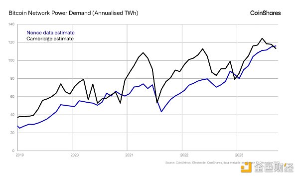 CoinMetrics 随机数数据的详细程度达到了新的水平,这意味着我们可以估算年度电力成本,这与剑桥大学的估算非常接近。