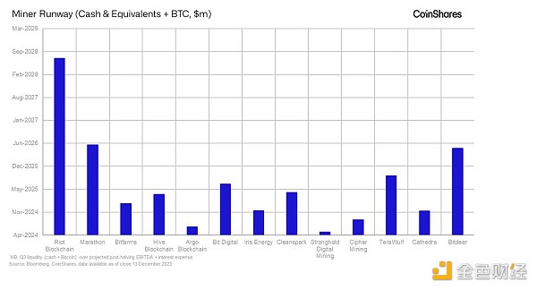 我们将跑道定义为矿工可以使用现金和比特币储备偿还现金运营支出的天数。整个行业没有标准的资金管理策略。有些人尽可能多地积累其产出,也称为“HODL”,而另一些人则不这样做,而是选择在生产比特币时出售比特币。资本充足、比特币余额较大的矿商在牛市中可能会获得更高的股权溢价,例如 Riot。然而,低跑道与高现金成本相结合,使得 Stronghold 等矿商面临比特币价格低迷的风险。