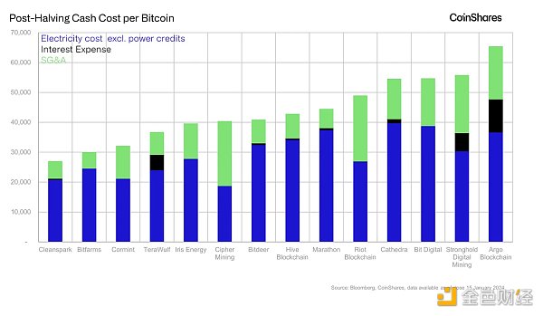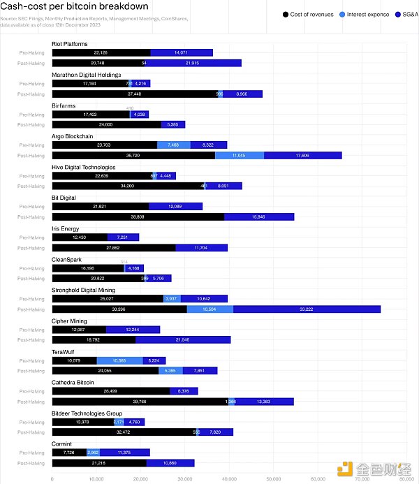 我们认为 Riot、Marathon、Bitfarms 和 Cleanspark 在减半中处于最佳位置。矿商面临的主要问题之一是巨额的SG&A成本。对于矿商来说,要实现收支平衡,减半可能会迫使他们削减SG&A成本,否则他们可能会继续亏损,并不得不清算其HODL余额和其他流动资产。