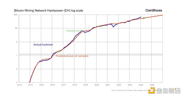 对历史数据的回顾表明,挖矿活动在减半事件之间有所增加。然而,由于其呈指数级增长,确定一个清晰的周期具有挑战性——我们已经在这方面做了一些工作。由于算力往往是一个不稳定的数字,使用历史数据趋势的偏差比纯粹的定性方法会产生更准确的结果。然而,一个关键问题是,大多数趋势线都包含未来信息,这意味着我们今天看到的趋势线在过去会有所不同。因此,最可靠的方法是根据样本外数据计算一条趋势线,该趋势线不受未来发展的影响。