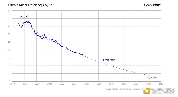 由于每个挖矿模型的效率以 W/T(瓦特/太拉哈希)为单位,因此可以计算整个比特币挖矿队列的整体效率。鉴于这条路径相当线性的进展,未来的趋势也可以预测。目前,该网络的加权平均效率为34W/T。仅今年一年,效率就提高了 8%,过去三年,效率提高了 28%。根据这些趋势,预计到 2026 年中期,随着芯片设计的不断改进以及更高效的挖矿硬件的上线,效率水平可能会低至 10W/T。