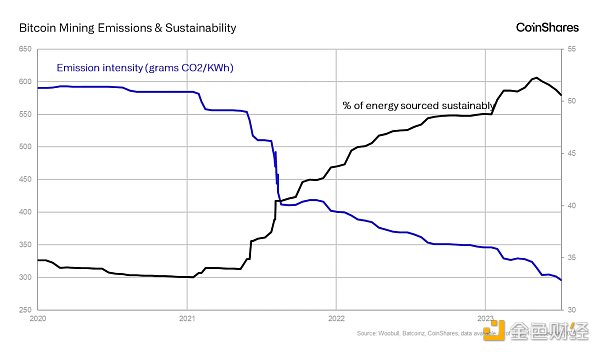 比特币挖矿始终追求最便宜的能源,这经常导致搁浅能源的利用,即无法轻易出售给现有电网的能源。通常,这涉及位于偏远地区的可再生能源项目。因此,使用可持续来源的电力进行比特币挖矿作业的趋势日益明显。根据丹尼尔·巴顿 (Daniel Batten) 的估计,用于开采比特币的能源中约有 53% 现在是可持续来源的。这一比例已经超过了金融业,正如 Daniel Batten指出的那样,金融业的能源消耗估计只有约 40% 来自可持续能源。