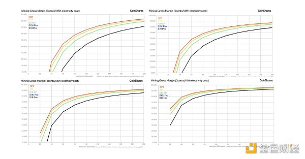 下面的矩阵表明,尽管 T21 是较新的型号,但 S21 在每种电力和算力价格场景中都优于所有其他钻机类型,因为具有更高的算力(影响收入)和更低的功耗(影响费用)。