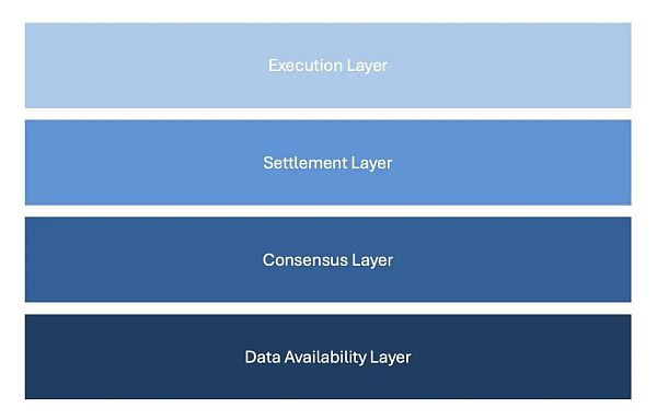 这个时候就有必要溯本追源,先把概念明确一下。事实上,执行层、结算层、共识层、DA层,这都属于 Celestia 提出的模块化区块链这个理论体系。