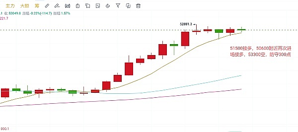 比特币自春节前开始,启动了一波强势的阶梯上涨行情, 上周五最高点到达52800上方,这是自2021年年底以来首次触及53000附近。回顾今年大饼的走势,自年初比特币etf通过,利多预期落地币价出现回落来到38000附近受到支撑后,行情迅速收复前期跌幅并一举打破前期压制48000,直奔2021年年底下跌以来的高点53000,从当前的技术指标来看,行情站上50000之后的每一波破位都未能得到强势延续,说明当前市场情绪以及资金不足以支持币价长期维持在一个相对高位,那么短线我们要谨防行情出现较为极端的回落。短线下方第一支撑看51500,行情给到可进场接多,防守300个点,如若行情意外跌破,底部支撑可参照这一波冲高回落的低点50600附近,行情给到这一带附近可尝试再次进场接多;上方短线压制参照53300,行情给到可尝试进场空,防守300个点。