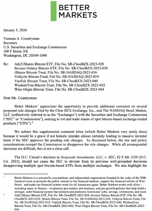 凯勒赫在1月5日致SEC秘书凡妮莎·康特里曼(Vanessa Countryman)的信中强调,如果SEC批准现货比特币ETF,可能会导致投资者面临重大风险: