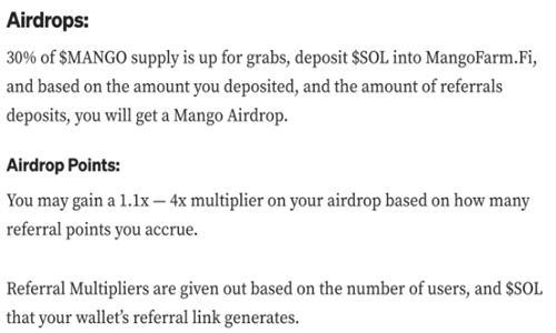MangoFarmSOL是Solana上的一个农业协议,承诺在SOL空间中实现“无与伦比的收益率”。根据1月5日发布的Medium帖子,其MANGO代币空投计划于1月10日进行。要参与空投,用户必须在协议中存入Solana SOL $90代币:
