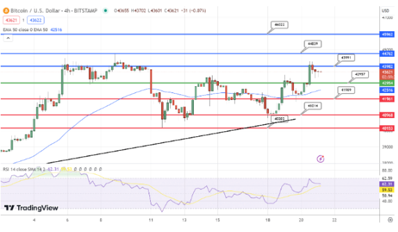 相对强度指数(RSI)现在为66,显示出牛市势头,但尚未进入超买区域,因此暗示着有更多的增长空间。比特币的价格持续保持在50天指数移动平均线之上,该线位于约42,300美元左右,强化了短期牛市的前景。资产的图表显示了一个从最近低点39,510美元开始的上升趋势线,进一步表明了持续的牛市势头。考虑到这些技术因素,比特币的即时预测是挑战43,512美元的阻力。成功突破这一水平可能为这种加密货币在短期内应对并潜在超越下一组阻力水平创造条件。