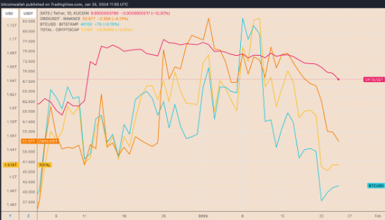 值得注意的是,2024 年迄今为止,ORDI 和 SATS 的价格分别下跌了约 34.50% 和 50%。这种下降主要是由于以比特币为首的整个加密市场日益增长的“卖出新闻”情绪。截至1月25日,ORDI和BTC的相关系数为0.66;在最近的历史中,它一直保持积极。此外,这种看跌势头与铭记费和比特币区块大小份额的显着下降相一致,凸显了对比特币序数的需求减少。铭文代币的价格走势往往与BTC本身密切相关,这主要是因为Bitcoin Ordinals使用比特币的区块链。