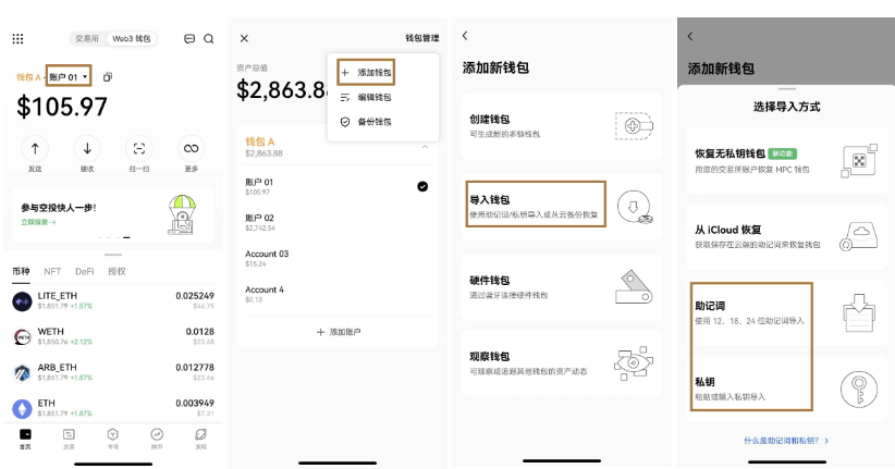 [2] 选择导入钱包 > 助记词或私钥,完成导入