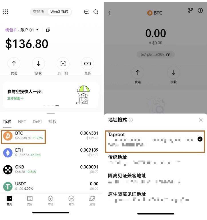 点击钱包首页的 BTC 进入 BTC 详情页,再是点击右上角的切换图标,即可查看你的 BTC 地址。默认展示 Taproot 地址,你也可以点击切换传统地址(Legacy)、隔离见证兼容地址(Nested SegWit)或原生隔离见证地址(Native SegWit)。