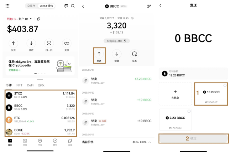 点击某一 BRC-20 资产,进入该币种详情页,点击发送,选择想要发送的铭文,点击确定,输入地址后完成转移。