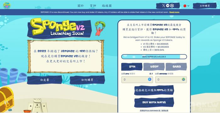市场都概叹 Sponge V1 之成功故事将延续至 V2 之成功,Sponge V1 乃 2023 年最大之模因币,市值由百万美金飙升至峰值十亿美金,使先行投资者获得百倍收益,持有者过万。