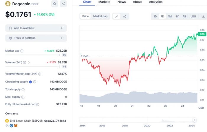 值得注意的是Dogecoin价格最近几日突然大涨超过15%,成为24小时涨幅最大的加密货币之一。这波急涨将DOGE市值推至高于ADA,成为市场第八大加密货币。