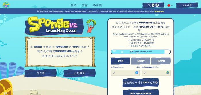 市场都概叹 Sponge V1 之成功故事将延续至 V2 之成功,Sponge V1 乃 2023 年最大之迷因币,市值由百万美金飙升至峰值十亿美金,使先行投资者获得百倍收益,持有者过万。