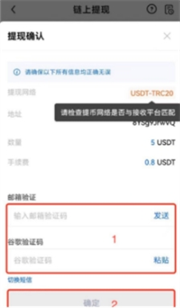 3.核对提币信息,包括网络、数量和地址,完成双重安全验证后,点击【确定】完成提币。
