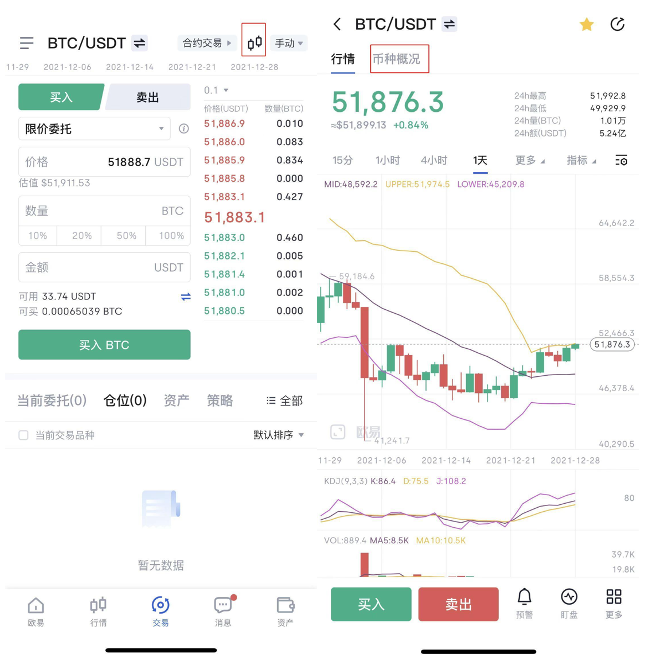 在【交易】页面点击右上角价格旁边的K线按钮,页面上方包含了交易币对、涨跌幅、成交价格和成交量等信息。下方是当前币对的K 线图,可以调节各种参数。接着下方有【深度】、【成交】两个页面,可以分析行情,点击右侧【币种概况】按钮可以帮您了解当前币种。
