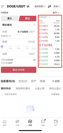 在【买入/卖出】页面右边是交易深度页面,可以在页面中看到买入和卖出的挂单情况,上方红色区域是卖盘,下方绿色区域是买盘。