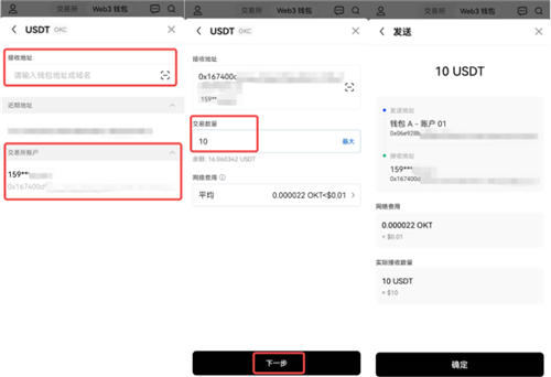 2)填写【接收地址】时,系统会自动推荐当前登录的【交易所账户】的接收地址,选择该地址,填入【交易数量】-【下一步】,确定发送信息无误后,点击【确定】,发送完成后,可【在浏览器查看】或【在交易所查看】发送详情。