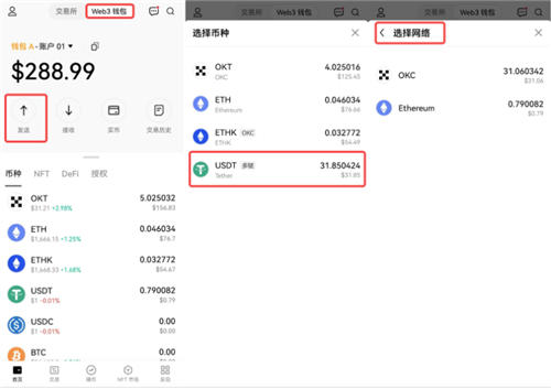 1)登录交易所账户,同时登录Web3钱包,在钱包首页点击【发送】,选择币种和网络。