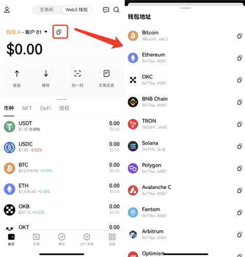 在欧意web3钱包点击复制地址图标,选择您想交易的网络所对应的钱包地址,转账给该地址即可充币。