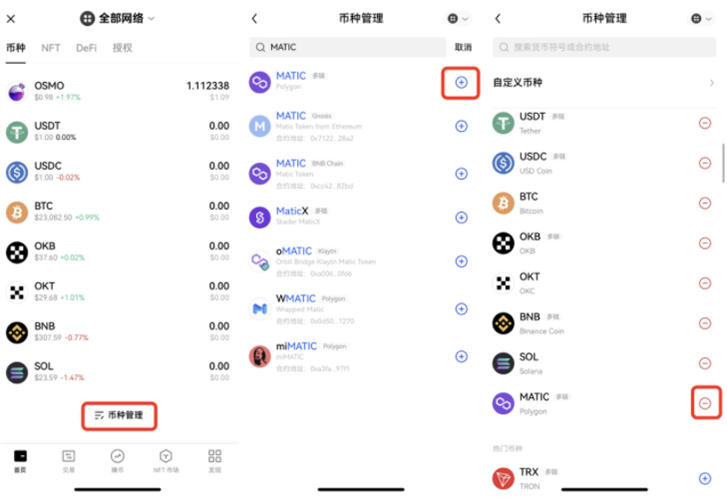 点击欧意web3钱包币种管理,在搜索框输入币种名称或合约地址,如 MATIC,点击 添加。也可以回到币种管理界面,点击 进行移除。