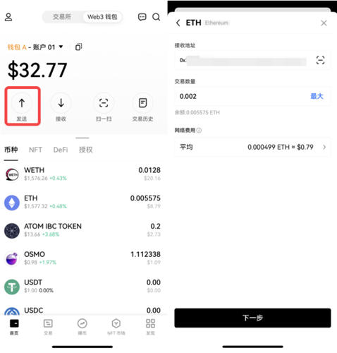 在欧意web3钱包选择要进行转账的钱包和账户,如钱包 A -账户 01,以 ETH 为例,点击发送,输入接收地址和数量,默认网络费用为平均,点击下一步并确认。