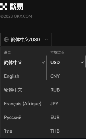 [3]安装完欧意交易所app后打开首页,出现下图一个语言选项,语言选择简体中文,本地选择USD即完成OKx中国版全部下载步骤。
