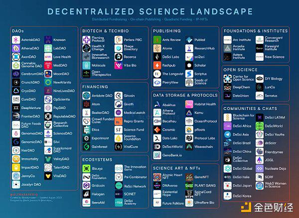 DAO 可以说是 DeSci 概念的基本存在形式,目前的 DeSci 的生态版图中,以 DAO 最为最繁荣。目前,DeSci 最大也是最需要直面的问题是融资难,除了 DAO 外,可以看出,注于去中心化融资的板块也占了整个赛道的一大部分,而 DAO 的存在目的最重要的也是为了解决融资难题。