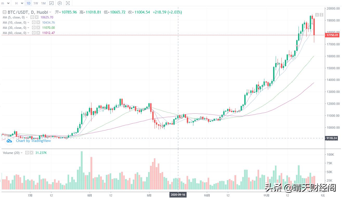 进入2020年以后除过3月份的黑天鹅事件导致比特币的价格严重失真下跌到了3800美元,这波上涨趋势截止到目前为止,最高点始终没能突破2万美元止步在了19500美元附近。11月26日美国的感恩节,也就是今天,比特币迎来了2000美元的下跌幅度,从19000 美元一路下跌至最近17000美元。