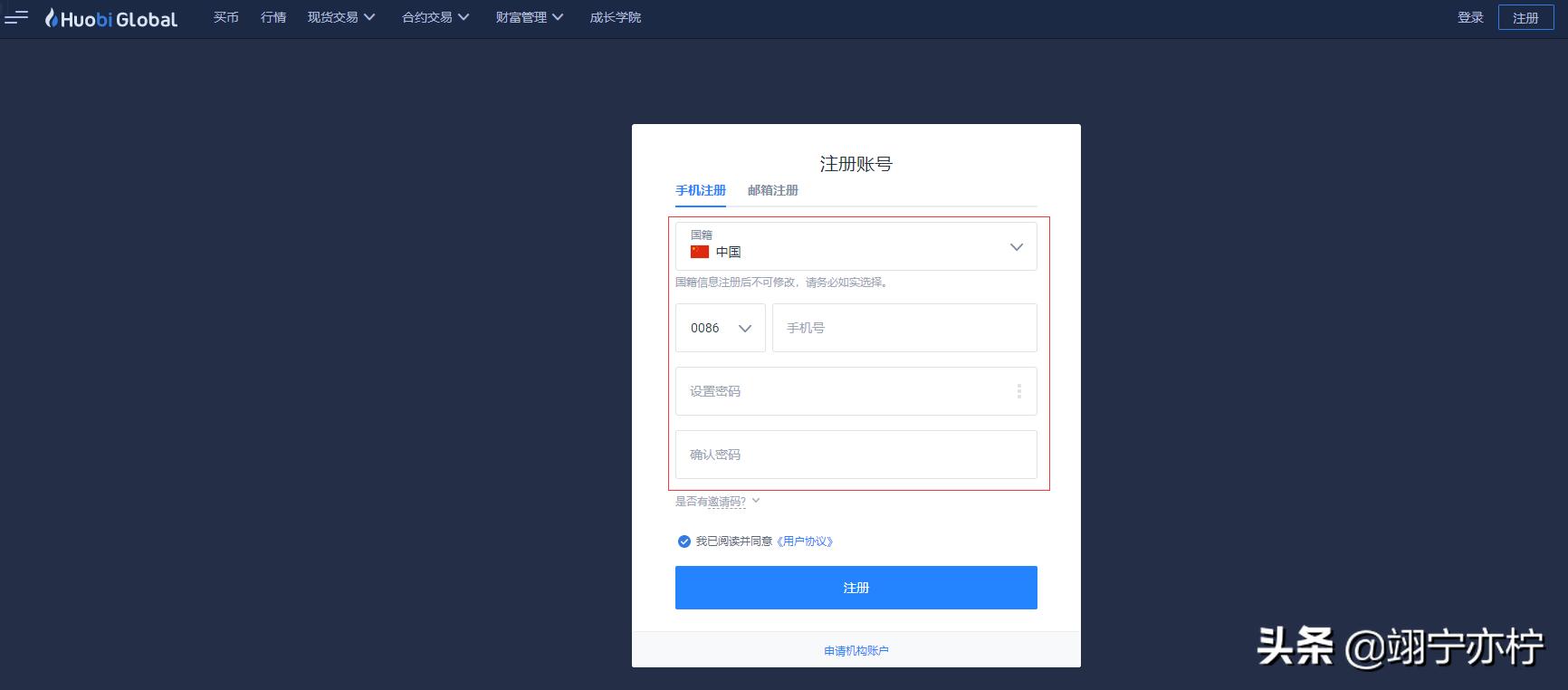 1.打开火币网,注册账号。
