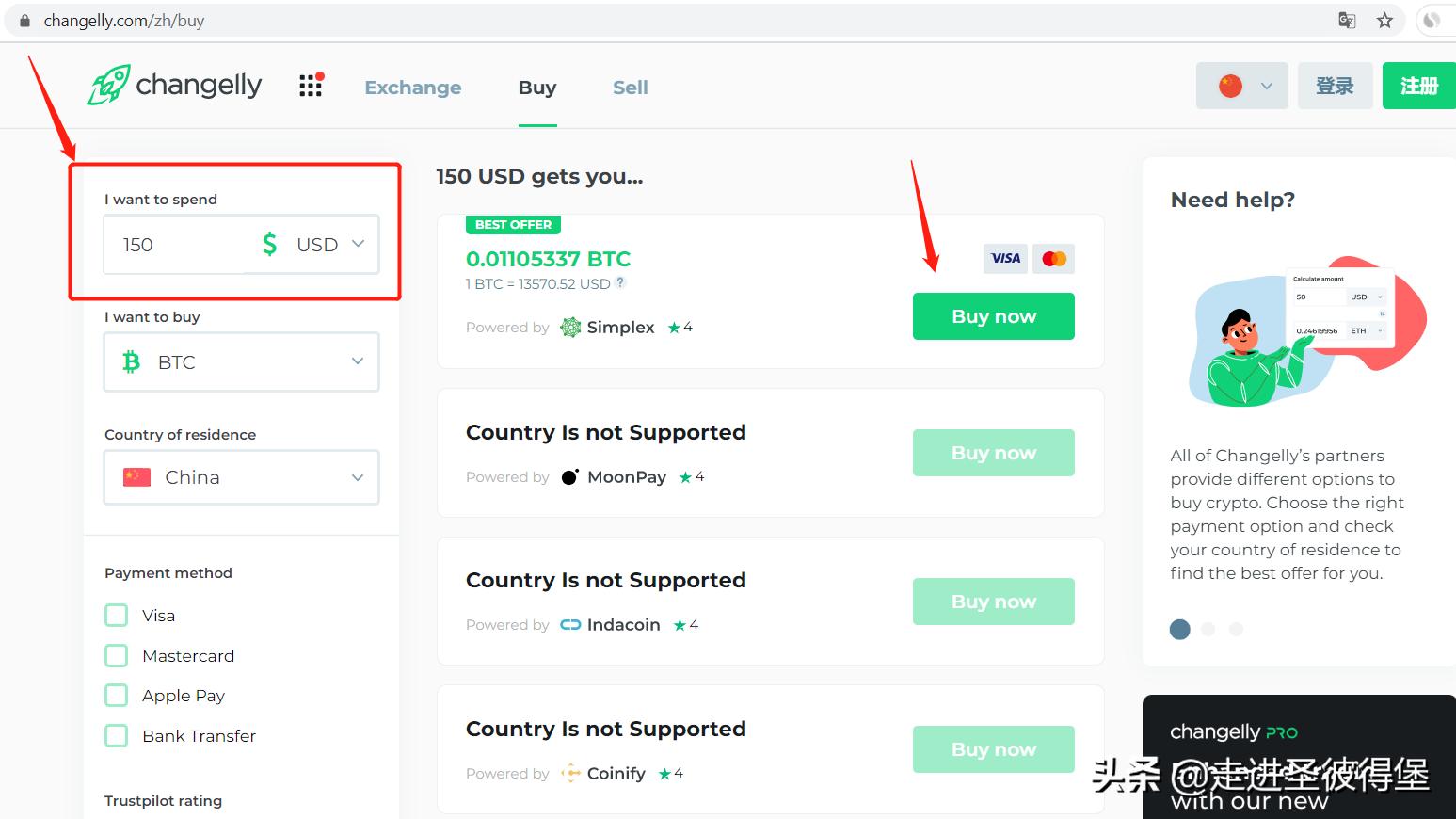 另一种是相对比较安全的方法,就是去类似Changelly这样的平台,提供正规的法币交易渠道,相当于是从平台手中直接购买,大大降低了交易风险。