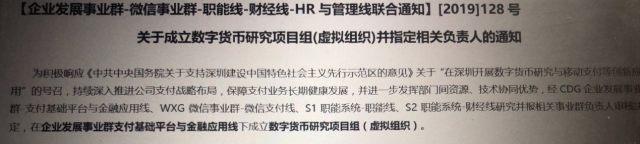 12月23日,一则关于腾讯成立数字货币研究项目组(虚拟组织)并指定相关负责人的通知(以下简称“通知”)引发业内关注。据了解,该通知系腾讯内部发出。通知内容显示,为积极响应《中共中央国务院关于支持深圳建设中国特色社会主义先行示范区的意见》关于“在深圳开展数字货币研究与移动支付等创新应用”的号召,持续推进公司支付战略布局,保障支付业务长期健康发展,并进一步发挥部门间资源、技术协同优势,经CDG企业发展事业群—支付基础平台与金融应用线,WXG微信事业群—微信支付线、S1职能系统—职能线、S2职能系统—财经线研究并报相关事业群负责人审核决定,在企业发展事业群支付基础平台与金融应用线下成立数字货币研究项目组(虚拟组织)。