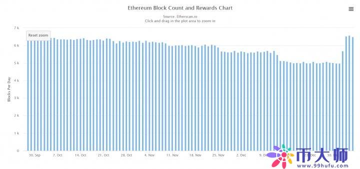显然,区块生成时间的减少也使得每日挖出区块的数量增加,同时也将提升以太币的通膨率。根据Etherscan的以太坊区块计算和奖励图表, 1月1日当天,矿工总共新增了4.980个新区块以及10.237枚以太币。不过到了1月4日,以太坊网络矿工竟新增6.570个新区块和13.437枚以太币,区块数量增加近32%;区块奖励也增加超过31%。