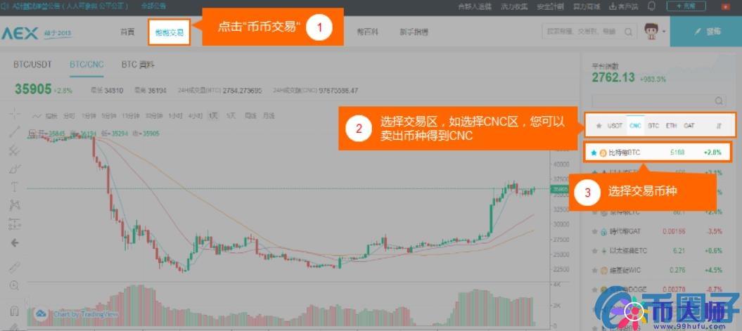 1.登录AEX账号后,在导航栏处点击币币交易,并选择交易对,这里以BTC/CNC为例子。