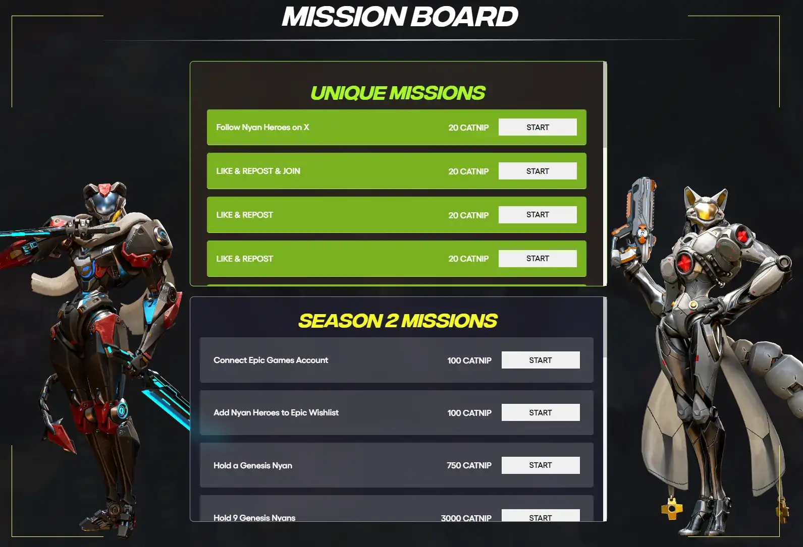 一方面,对于所有用户,他们只需访问活动官网,并通过推特进行注册即可参与。随后,完成一系列简单的社交任务,如关注、点赞、转推等,即可获得 Catnip 奖励,并且这些 Catnip 奖励在未来可直接兑换成 NYAN 代币。此外,通过邀请好友参与活动,用户还将获得更多的 Catnip 奖励,为社区的扩大贡献一份力量,让更多人能够享受到 Nyan Heroes 带来的乐趣和奖励。