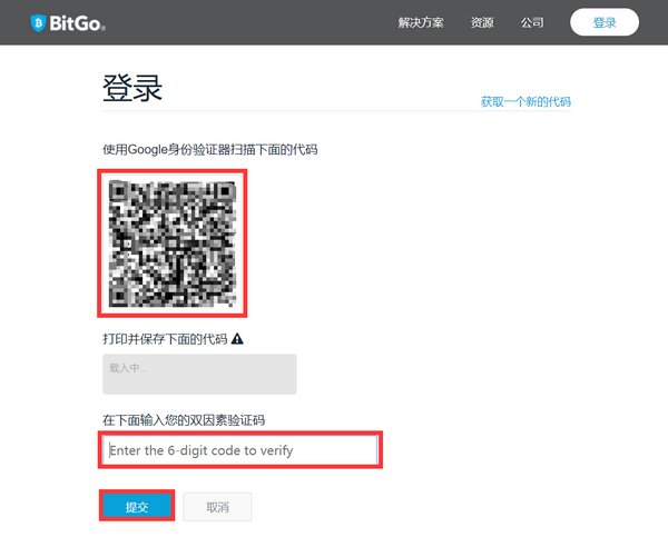 3。页面显示登录验证提示,并单击“下一步”。使用Google Authenticator APP扫描二维码获取验证码,输入验证码点击“提交”。然后页面会自动跳转到BitGo使用条款,阅读后勾选“我同意使用条款”并点击“提交”。