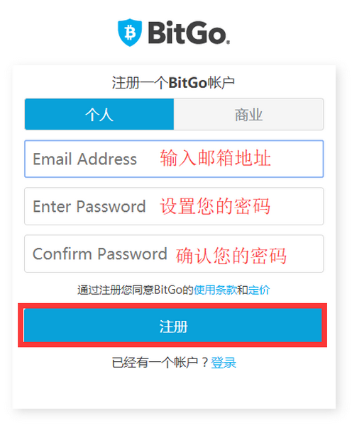1。打开浏览器,访问BitGo官方网站,点击“注册”,依次输入相关信息,完成后点击“注册”。系统会向相应邮箱发送激活邮件,请仔细查看,并根据操作提示激活账户。