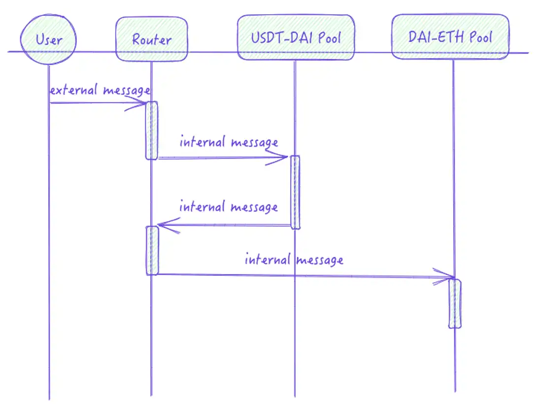 例如我们开发一个 DEX,如果采用 EVM 中常见的范式,通常会有一个统一的 router 合约用于管理交易路由,而每个 Pool 都单独管理某个交易对相关的 LP 数据,那么假设当前有两个池子 USDT-DAI 和 DAI-ETH。当用户希望通过 USDT 直接购买 ETH,就可以通过 router 合约在一笔交易中顺序请求这两个池子,完成原子性交易。然而在 TON 中就没有这么容易实现了,需要思考新的开发范式,若仍然复用该该范式的话,那信息流可能是这样的,这个请求将伴随一个由用户发起的 external message 和三个 internal messages 完成(注意这是用于说明差异性的,真实的开发中甚至连 ERC20 的范式也要重新设计)。