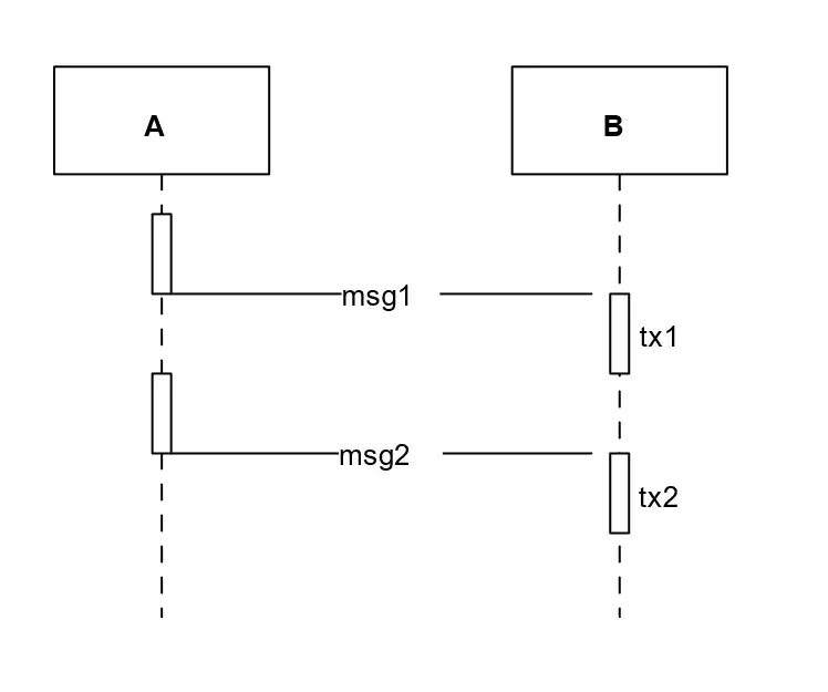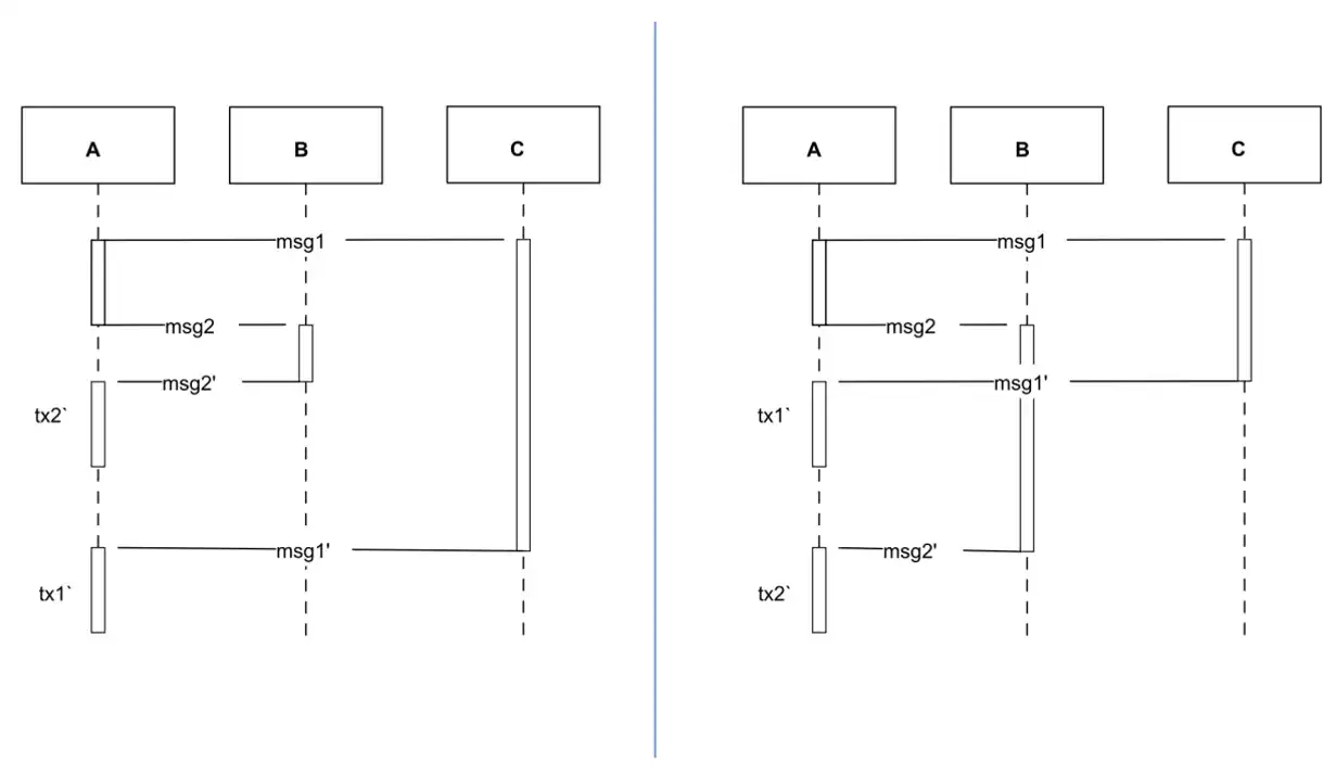 在这个模型中,A 和 B 分别表示两个智能合约,则有如果 msg1_lt < msg2_lt,则 tx1_lt < tx2_lt 的时序关系。