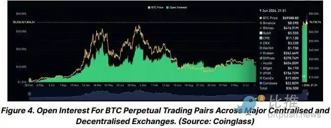 如上图所示,BTC 和山寨币的未平仓合约 (OI) 一直很高。Coinglass 的数据显示,各大交易所的 BTC OI 在 6 月 6 日创下了 368 亿美元的历史新高。尽管周五价格有所回调,但 OI 目前仍维持在 360 亿美元以上的水平。」