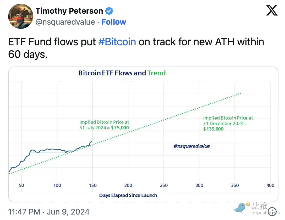 加密分析师 Timothy Peterson 在 X 平台表示,如果按照目前的速度持续下去,现货 BTC ETF 的资金流入速度将使 BTC 有望在 7 月 31 日创下历史新高。此外,如果流动性以目前的速度持续下去,到年底 BTC 的价格将达到 135,000 美元。