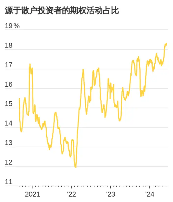 显而易见的是,这个词还有这种交易风格正流行起来。随著 5 月份「堕落者」和「堕落者交易」在网上被提及的次数大增,来自 J.P. Morgan Global Quantitative and Derivatives Strategy 的数据显示,当月源于散户投资者的期权活动占比飙升至 18% 以上,创下至少是自 2020 年 8 月以来的最高水平。