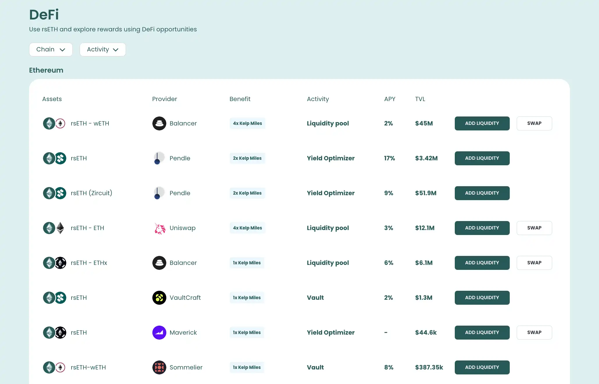Kelp DAO 接受包括 stETH、sfrETH 以及原生 ETH 在内的 LST,用户质押后获取积分及代币 rsETH,可以在多个 DeFi 项目中使用。目前,Kelp DAO 已在主网以及多个二层网络上线,用户可以在 Arbitrum、Blast 等网络上原生再质押他们的 ETH。