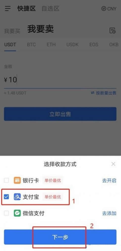 2.选择想要的收款方式,例如支付宝,点击下一步,再点击确认出售。