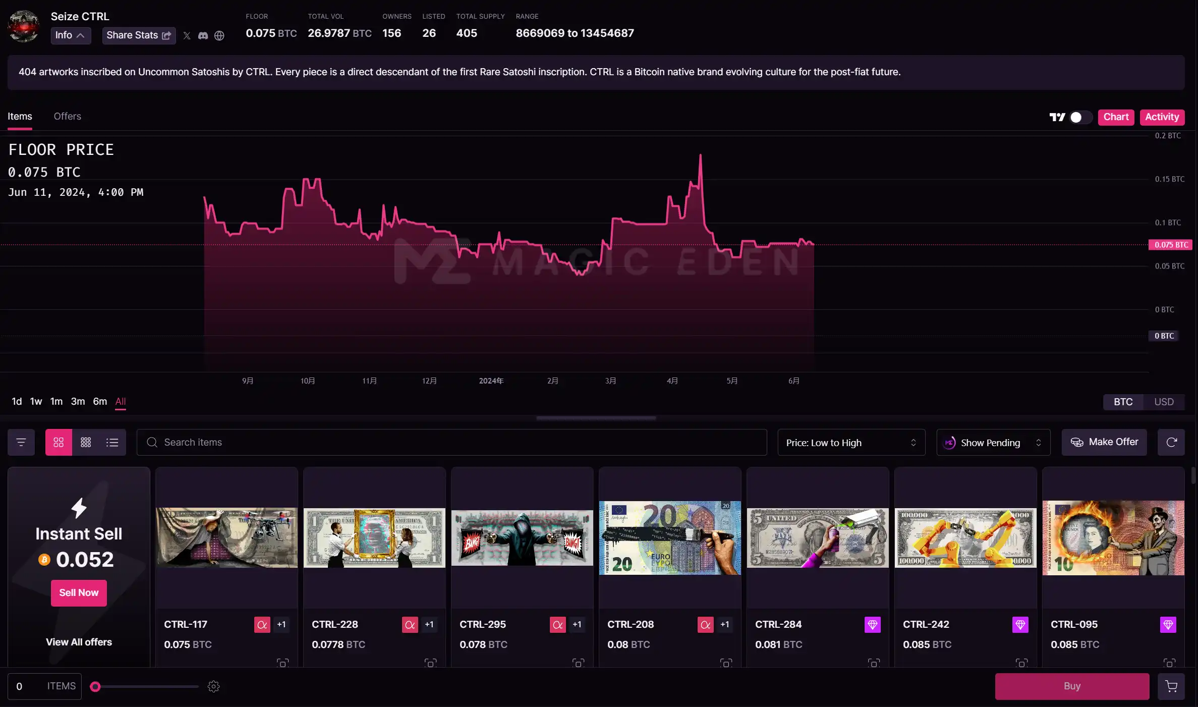 这是 Seize CTRL @SeizeCTRL 部署的第 120 号符文。借用金狗博士的介绍,「CTRL 的自我定位是后法币时代的比特币原生文化品牌」。CTRL 绝对是在稀有聪上玩艺术的 OG,比如下面这个全部刻在 Uncommon 聪上,总量为 404 的系列,地板价现在都有 0.075 比特币。