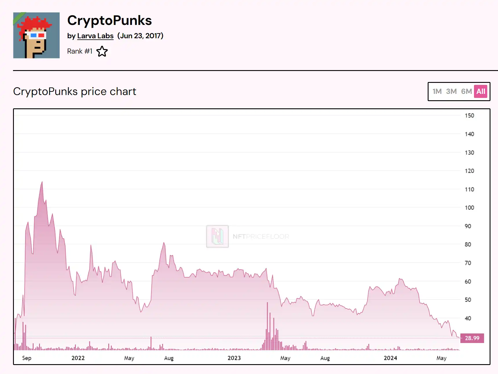 而现在,CryptoPunks 的地板价跌破了 30 ETH,这是自 2021 年 8 月以来的第一次。