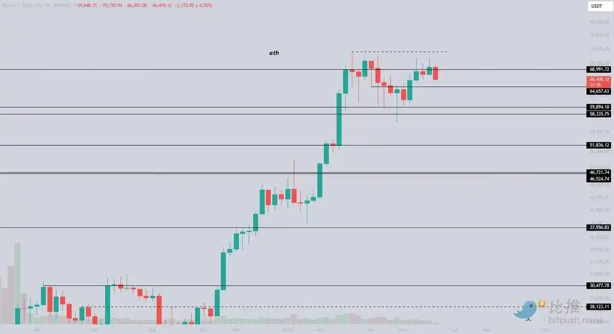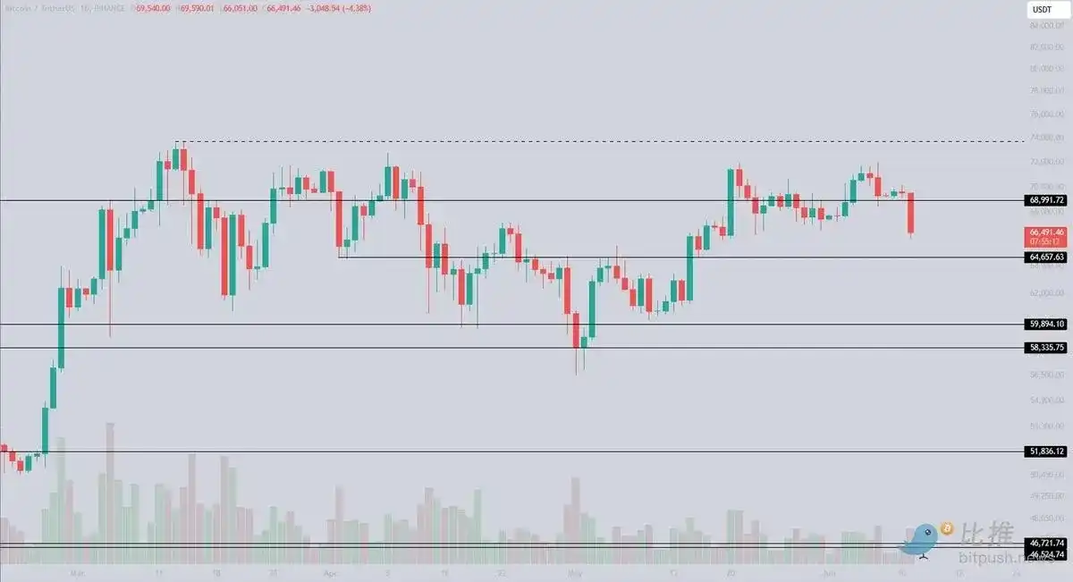 他认为,从日线图来看,下一个目标是每日支撑位 64, 650 美元,如果 BTC 测试并成功突破该支撑位,有望看到强劲反弹。否则,交易员可能会度过「一个悲惨的夏天。」
